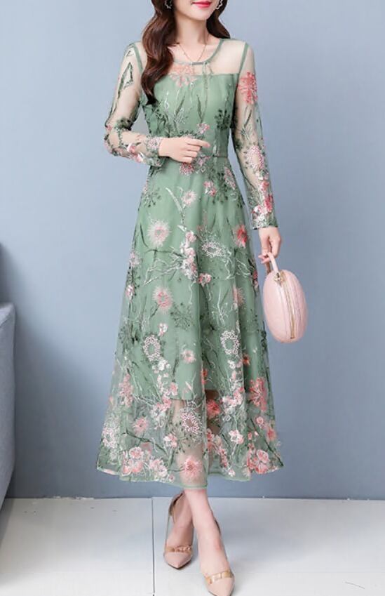 ☆花柄刺繍メッシュ☆ ワンピース シースルー ロング丈 長袖