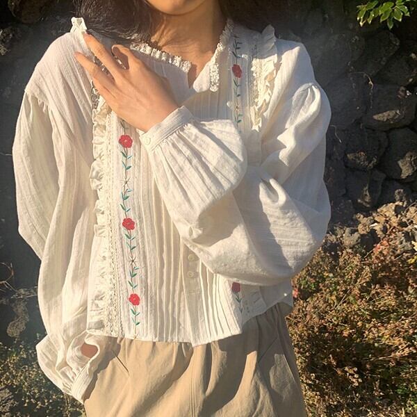 ヴィンテージ刺繍パッチワークのシャーリングシャツ。