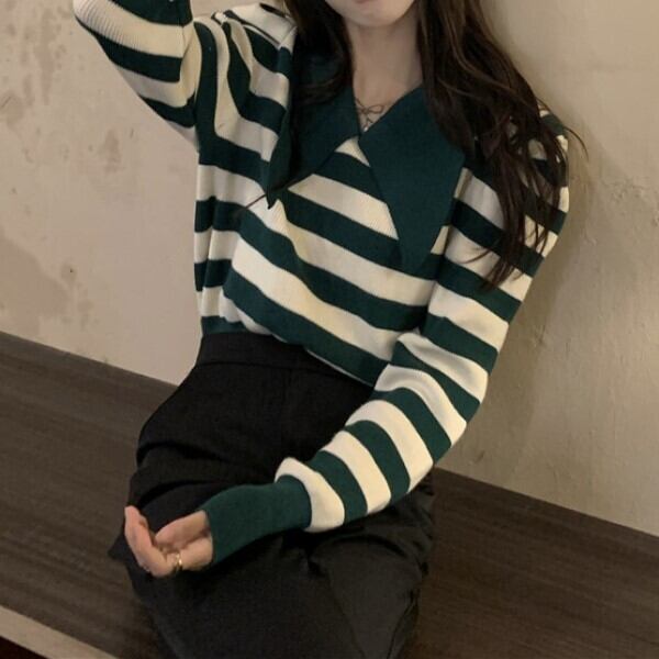 ショート丈 ドールカラー トップス ヴィンテージ ストライプ 長袖 ニット セーター
