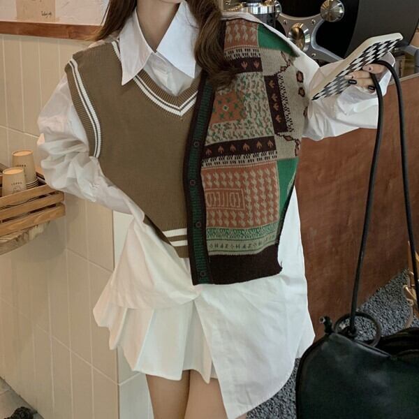 ins風デザイン パッチワーク 重ね着風 長袖 シャツ アシンメトリーデザイン