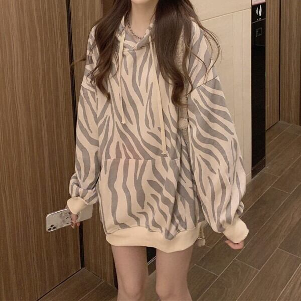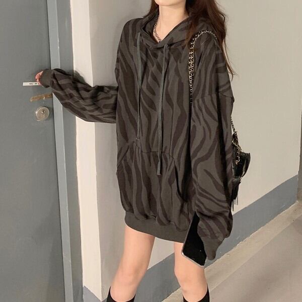 長袖 ゼブラ柄 フード付きセーター パーカー ルーズフィット