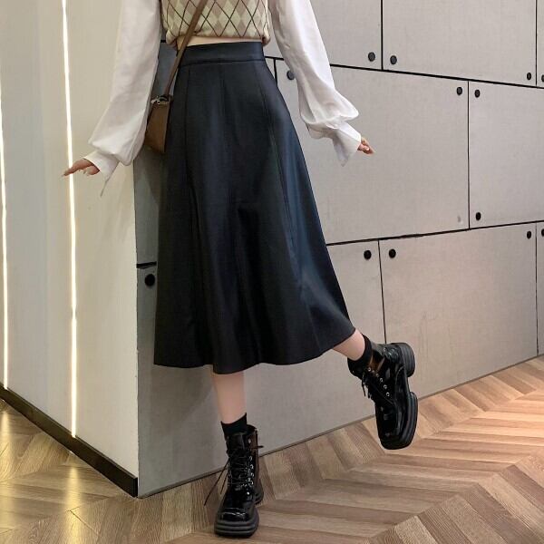 今流行りのレザーのミディアム丈のAラインスカート
