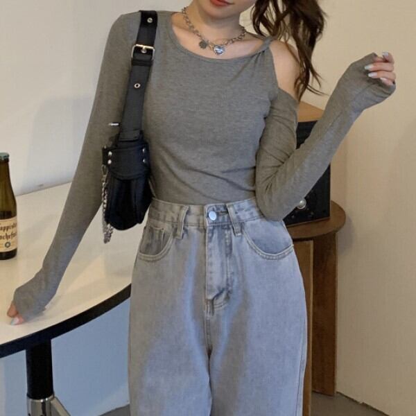 スリム フィット インナー 長袖 Tシャツ アシンメトリーデザイン クルーネック