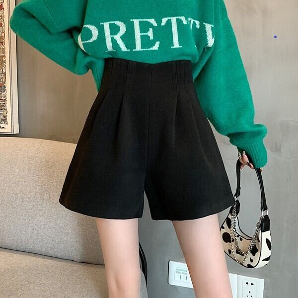 ブラック ウール ショートパンツ ハイウエスト Aライン ワイドパンツ