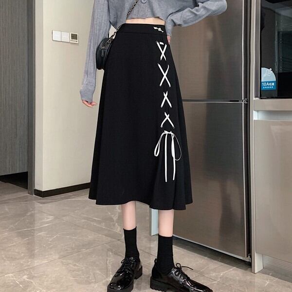 ハイウエスト ミディアム丈 スカート ブラック リボン 刺繍