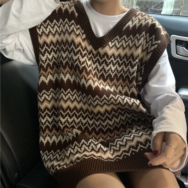袖なし ニット ベスト ルーズフィット レトロデザイン Vネック ボーイッシュ カジュアル