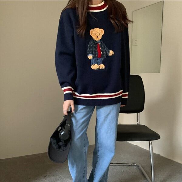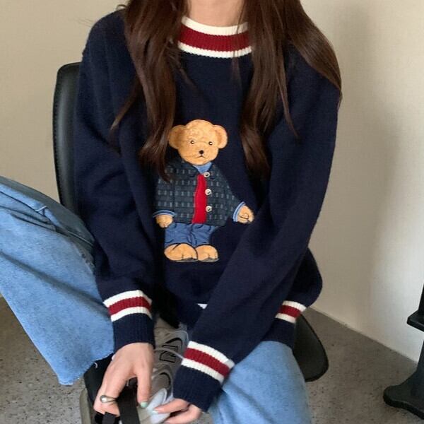 刺繍プルオーバー ニット セーター くまさん クルーネック トップス kawaii カジュアル