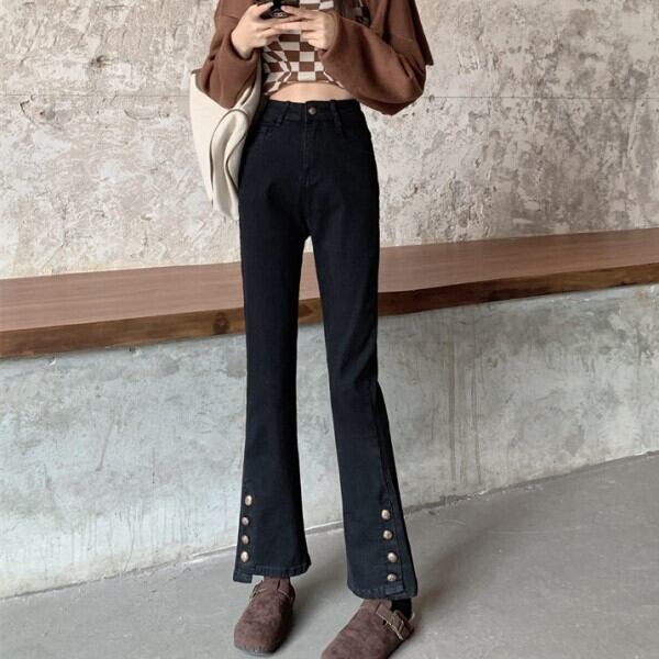 マイクロフレア 9分丈パンツ デニム ボタンデザイン ストレートフィット ハイウエスト