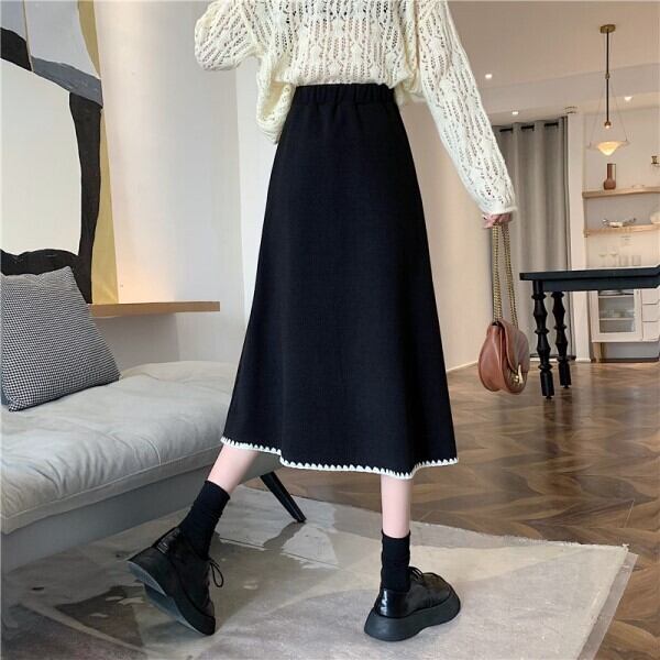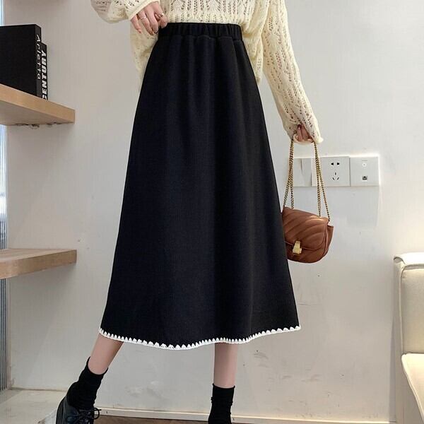 ブラック ニット スカート ミディアムロング丈 Aライン スリムフィット ハイウエスト
