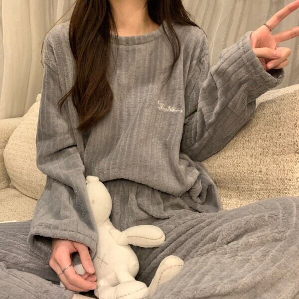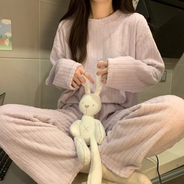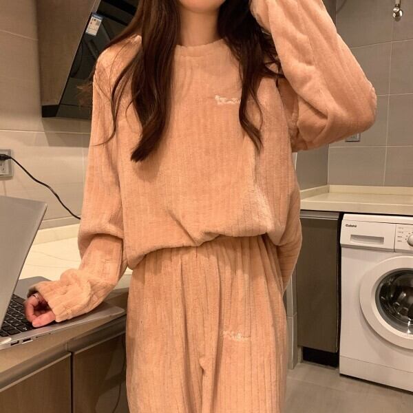 ピュアカラー ins風 フリース 長袖 ルームウェア パジャマ 2ピース