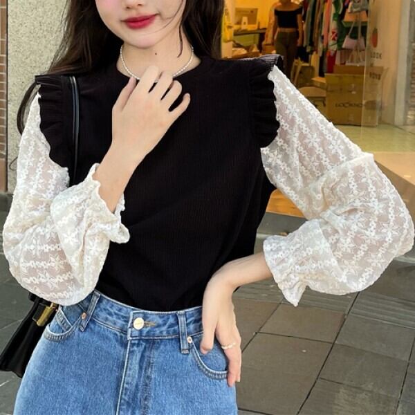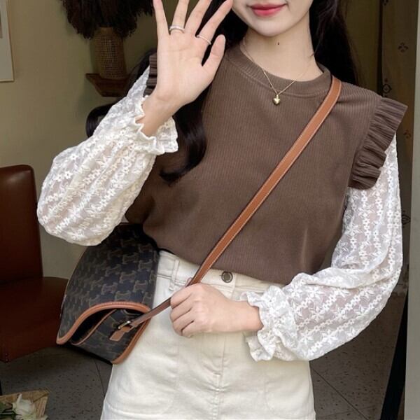 デザインレース 長袖 トップス ins風 ツーピース風 フレア袖