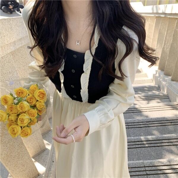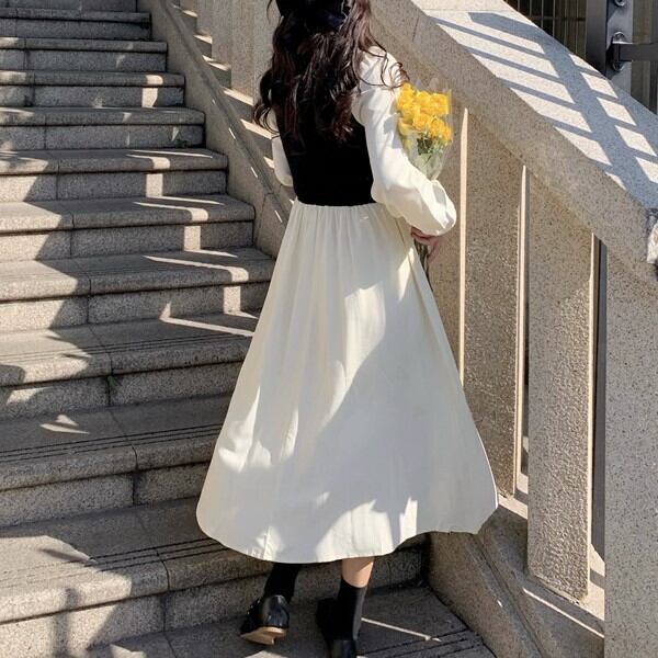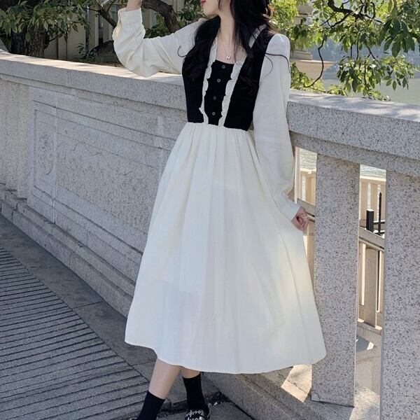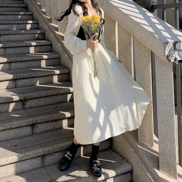 Aライン ロングスカート ワンピース 長袖 スクエアネック フリル