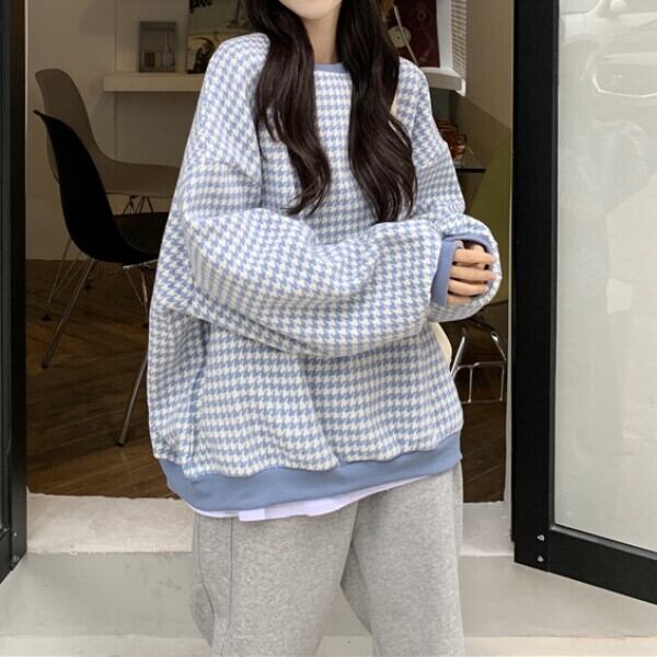 ラウンドネック ルーズフィット 千鳥格子柄 トップス