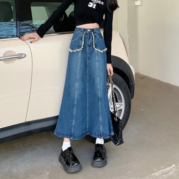 デニム素材のミディアムロング丈のスカート