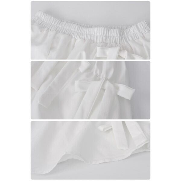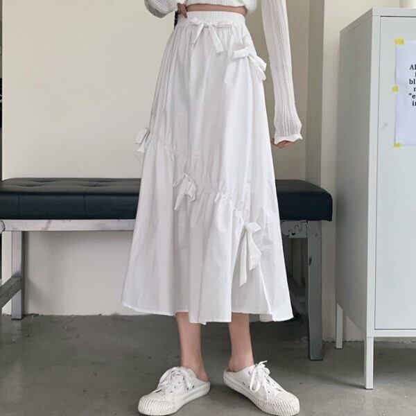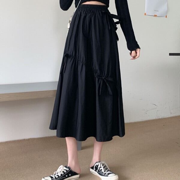 ハイウエスト アンバランス リボン ギャザー デザイン 薄手 Aライン スカート