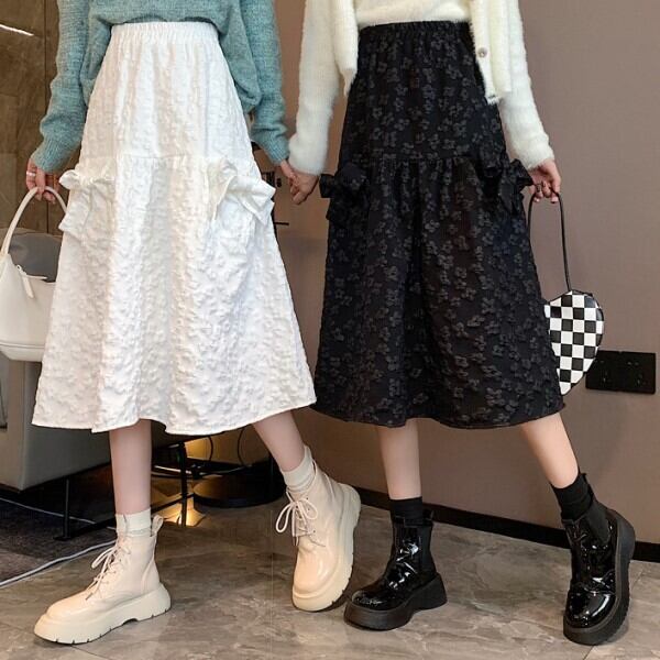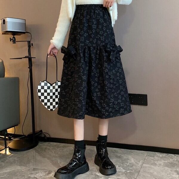 ミディアム丈 Aライン スカート ハイウエスト 西洋風 リボンデザイン