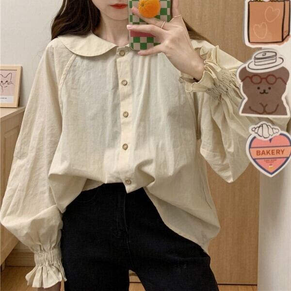 綿素材 長袖シャツ ベージュ フレッシュシャツ ボタンシャツ 丸襟