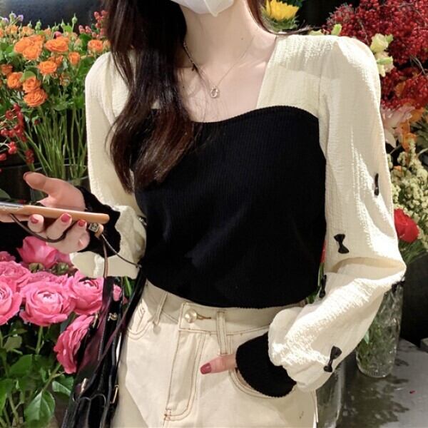 長袖 スクエアネック トップス リボンデザイン プルオーバー ルーズフィット