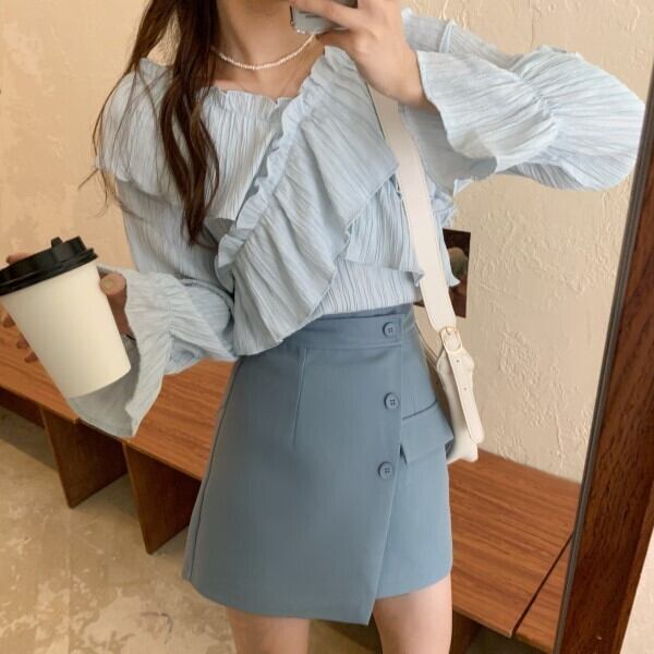 フレンチシャツ デザイン感 Vネック 長袖 フリル トップス