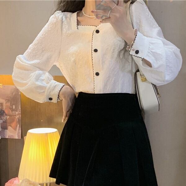 シックデザイン スクエアネック 長袖 フラワー モノクロ トップス