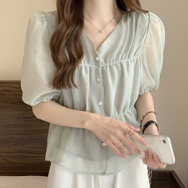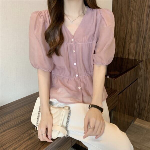 フレンチ シャツ シースルー 半袖 Vネック シフォン ふんわり パフスリーブ